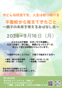 - 【2月開催報告】不登校の親子のためのおはなし会|福岡県みやま市・あすなろフリースクール2026年2月16日(月)【2月開催報告】 今回… 続きを読む: 【2月開催報告】不登校の親子のためのおはなし会|福岡県みやま市・あすなろフリースクール